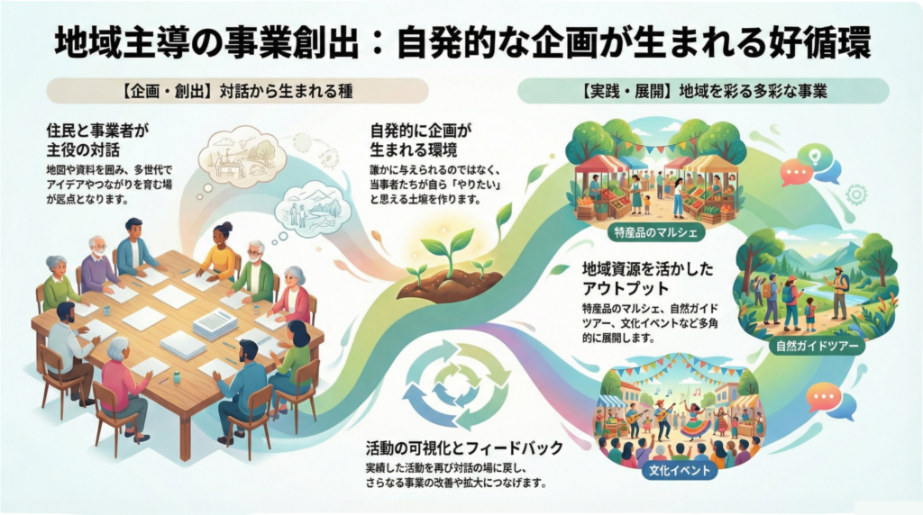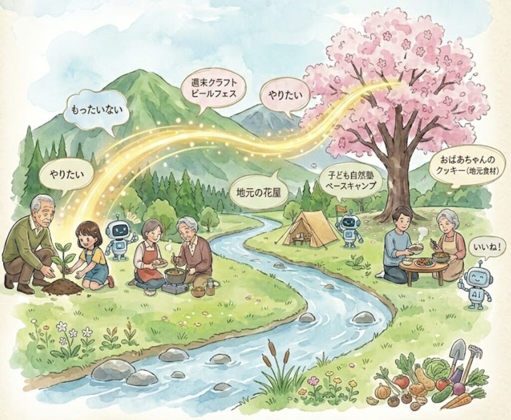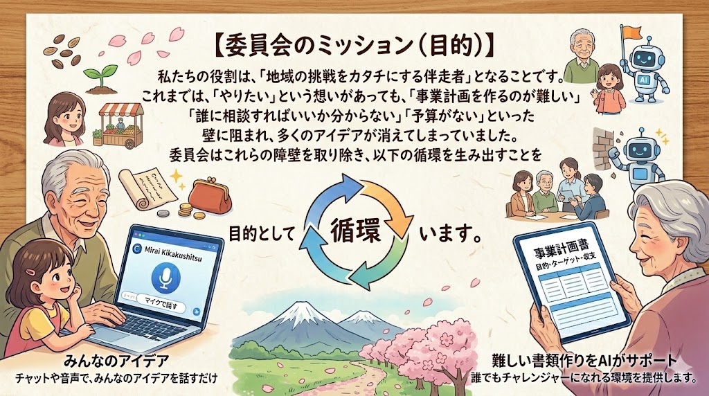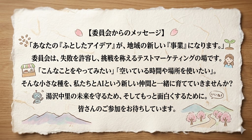 「あなたの『ふとしたアイデア』が、地域の新しい『事業』になります。」委員会は、失敗を許容し、挑戦を称えるテストマーケティングの場です。「こんなことをやってみたい」「空いている時間や場所を使いたい」。そんな小さな種を、私たちとAIという新しい仲間と一緒に育てていきませんか?