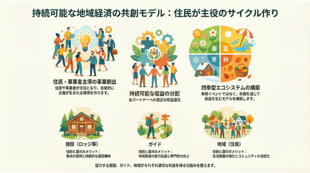 私たち湯沢中里グリーンシーズン推進委員会は、単なるイベント主催団体ではありません。住民の皆様や事業者、観光のお客様が持つ「やりたい」「もったいない」という想いを形にし、地域にある未活用の資源を「宝」へと変えるためのお手伝い(土台)です。